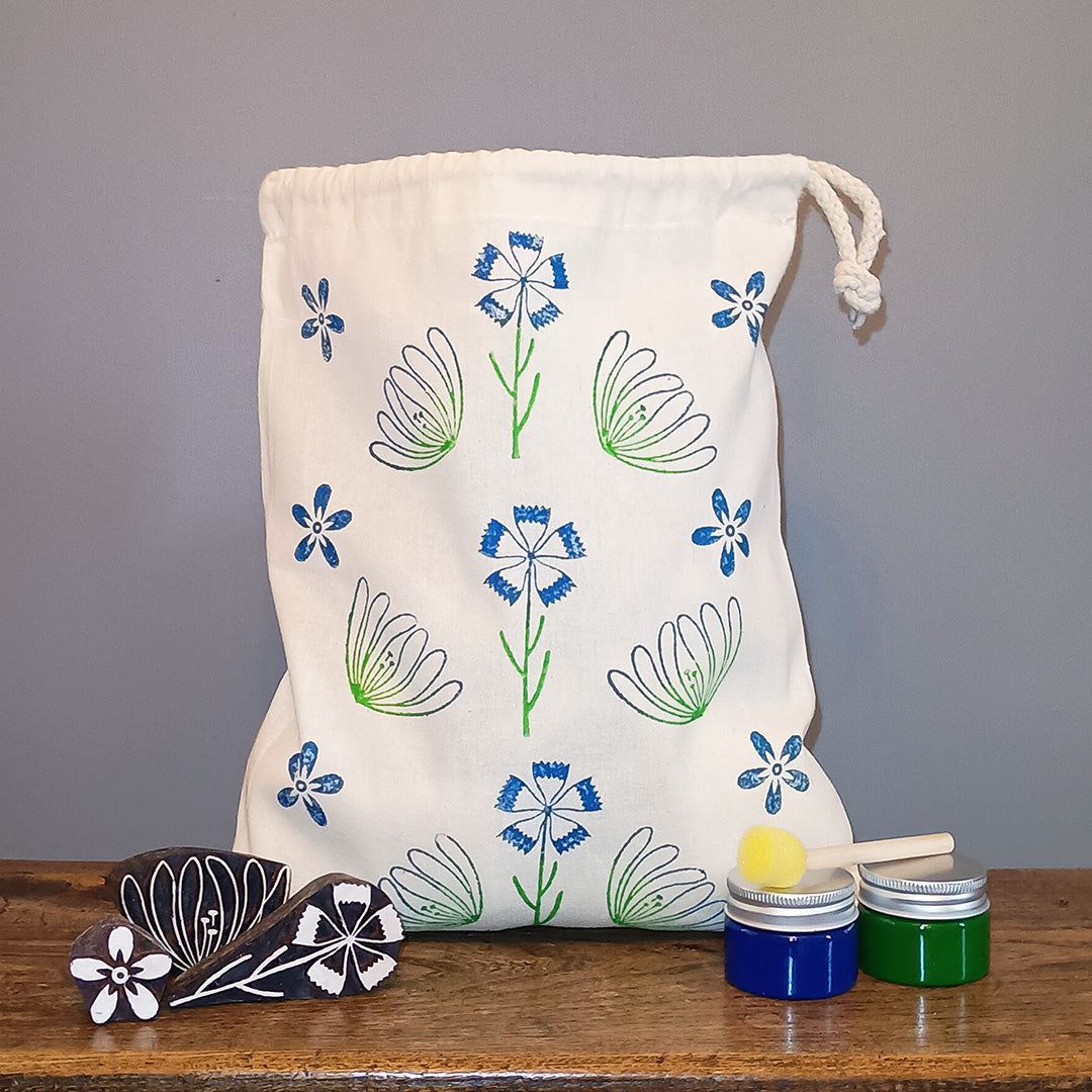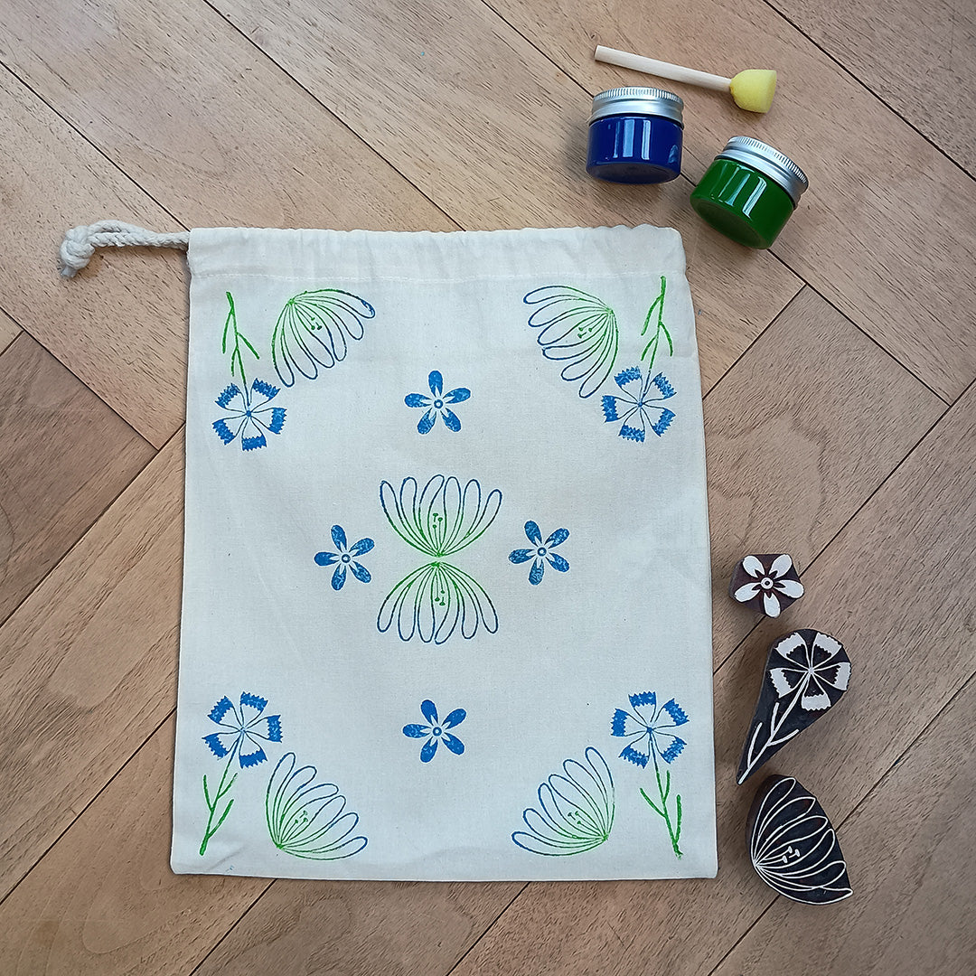 Floral drawstring bag wood block printing kit